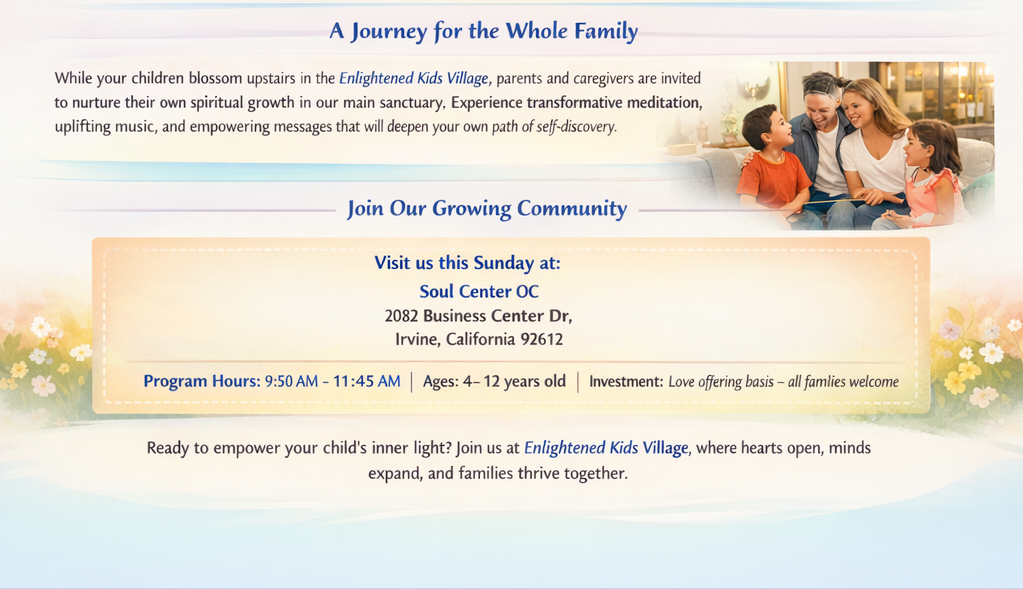 Welcome to the Enlightened Kids Village at Soul Center OC – a transformative Sunday morning experience designed to nurture your child’s inner light and infinite potential. In our warm, welcoming space, children embark on a journey of self-discovery, compassion, and wonder that will shape them into resilient, empathetic individuals ready to create a brighter tomorrow.